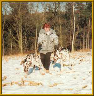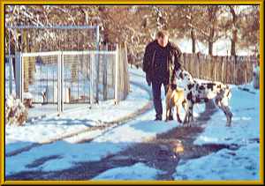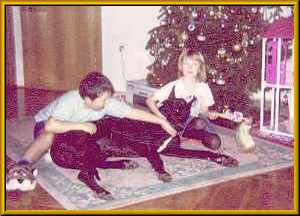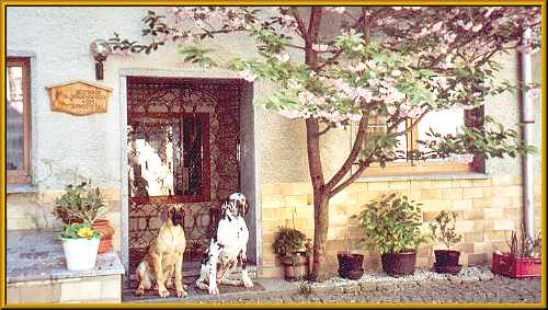 1989, nach dem wir mit unseren Umbau fertig waren, kam die Überlegung einen Hund zu kaufen. Der Familierat tagte. Was sollte es für eine Rasse sein? Welche Eigenschaften sollte er haben? So kamen wir zu den Merkmalen er sollte groß, wachsam, familiebezogen und sehr kinderlieb sein. Vor allem Letzteres, da unser beiden Kinder zu diesem Zeitpunkt gerade drei und sechs Jahre alt waren. Oma Sigrid wollte einen Dalmatiner, Mutter Ramona einen Boxer und Vater Günter eine Dogge. Über das Wesen von Dalmatinern und Boxern wussten wir bescheid, da beide Hunderassen in unseren Bekanntenkreis vorhanden waren. Über Doggen wussten wir gar nichts, außer das sie groß sind. Wir einigten uns darauf, erst einmal Informationen über Doggen einzuholen und uns dann zu entscheiden. Also kam Lektüre auf den Tisch, Bekannte wurden nach Doggenbesitzern befragt und die Zeitung wurde studiert. Im Deutschen Doggenzwinger von der Skatstadt in Altenburg wurden wir dann fündig. Hier bekamen wir von Familie Kietzke die Informationen über Doggen die wir wollten. Ein Besuch auf der Doggenausstellung in Weida konnte uns noch weitere Informationen und Eindrücke über diese Hunderasse bieten. Hier hatten wir die Gelegenheit mit mehreren Doggenbesitzern ins Gespräch zu kommen und uns von dem einzigartigen Wesen dieser Rasse beeindrucken zu lassen. Wir waren uns dann einig, dass genau eine Deutsche Dogge all die Eigenschaften besitzt, die wir uns vorgestellt haben. Also wurde mit den Großeltern ein Kompromiss geschlossen und wir einigten uns auf eine gefleckte Dogge als neuen Mitbewohner. Wieso es dann eine schwarze Doggendame wurde erzählen wir unter “Der Anfang”.